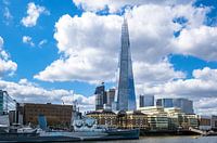 Het oorlogschip HMS Belfast en de 306 meter hoge toren van glas en staal, The Shard, zijn blikvangers langs de Zuidoever van de rivier de Theems in Londen. De blauwe lucht met witte wolken reflecteert in de vele glazen panelen van deze toeristische attractie. Deze foto is gemaakt in April 2023.