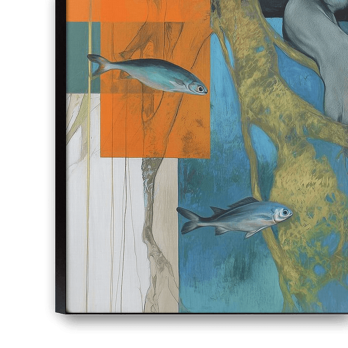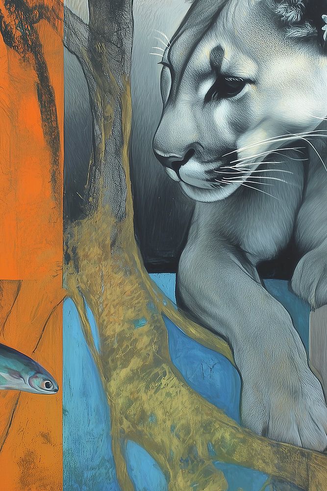 Een elegante poema rustend tussen bomen en geometrische vlakken, gecombineerd met zwemmende vissen die een droomachtige tegenstelling vormen. Het werk verbindt land en water, natuur en abstractie. De compositie met oranje, blauw en aardse kleuren geeft het een moderne, collage-achtige uitstraling, alsof de poema door verschillende werelden tegelijk beweegt: de jungle, de rivier en een abstract schilderij.