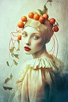 Een dromerig en vervreemdend portret van een jonge vrouw in fine-art stijl. Ze draagt een theatrale kraag en een hoofdtooi van bessen, met felrode details die contrasteren tegen de zachte, vintage-achtige achtergrond. Haar blik is tegelijk krachtig en kwetsbaar – als een stille clown uit een andere wereld. Dit werk ademt een combinatie…