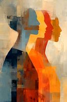 Een gestileerde illustratie met vier menselijke profielen op een rij, met hun silhouetten verweven in een artistieke compositie. De figuren zijn afgebeeld met abstracte vormen en geometrische patronen, tegen een gestructureerde achtergrond van zachte neutrale tinten. De algehele compositie roept een gevoel van transitie en diversiteit op.