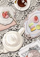 Een smakelijk stilleven met thee, aardbeien, room en macarons. Gouden bestek, de krant maken het plaatje compleet en de toegevoegde schaduwen geven dit werk een unieke optische illusie van 3D-effect.