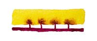 Sfeervolle, mystieke en minimalistische aquarelschilderij met 4 Bordeauxrode bomen onder een geel oranje hemel.