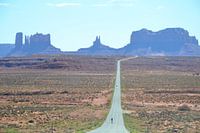 Skateboarder riding down a long stretch of road in Monument Valley, United States.
