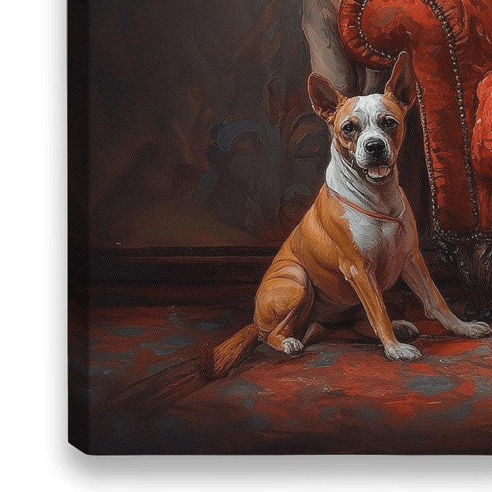 Een groepsportret met een Duitse dog, die soms ook de Apollo (naar de oude zonnegod) onder de honden wordt genoemd, ligt hier heel koninklijk op een sofa als de leider van een groep honden van verschillende rassen.