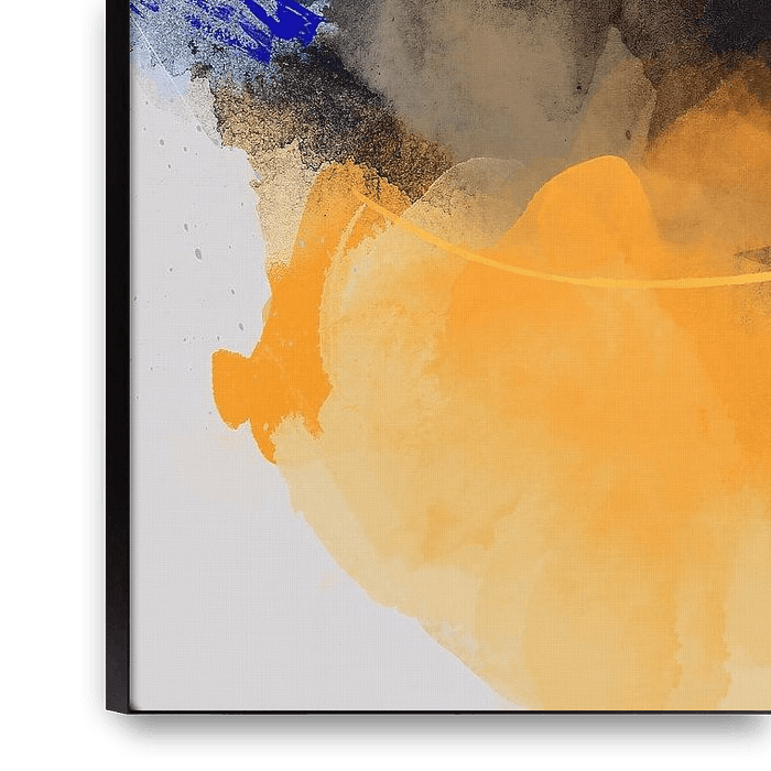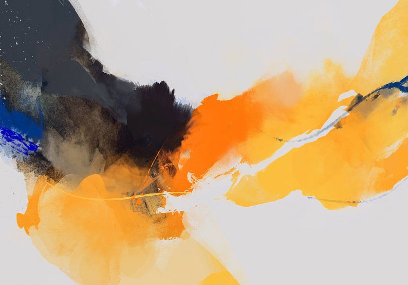 A piece full of movement and color rhythm. Bright orange-yellow masses leap horizontally, contrasting sharply with a deep blue-black background, like a surge of joyful energy. Fluid brushstrokes and vivid contrast bring vitality and positivity to any space.