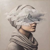Het gezicht van een vrouw vervloeit met wolken en een bergtop — alsof haar innerlijke wereld een oneindig landschap vormt.