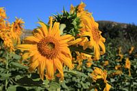 Een zonnebloem tegen een blauwe en groene achtergrond. Deze foto is ideaal voor een tuinposter /tuinposters.