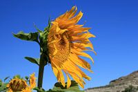 Een zonnebloem tegen de afstekend tegen een blauwe heldere lucht. Deze foto is ideaal voor een tuinposter /tuinposters.