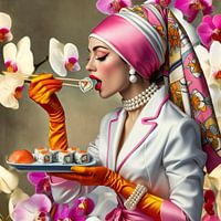 Dit digitale kunstwerk is een gedurfde en speelse herinterpretatie van Meisje met de parel, waarin klassieke elegantie en moderne luxe samenkomen. De vrouw, gehuld in zijde, parels en satijnen handschoenen, geniet verfijnd van sushi te midden van een achtergrond vol orchideeën. De rijke kleurencombinatie van roze, wit en goud straalt…