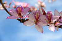 Foto van een paars/witte bloesem afstekend tegen een blauwe lucht. Deze foto is ideaal voor een tuinposter (tuinposters).