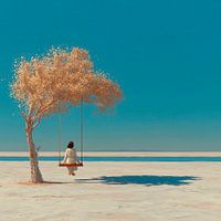 Een kunstwerk van een vrouw die op een schommel zit hangend aan een boom midden in een desolaat landschap. De afbeelding creëert een sfeer van avontuur en vrijheid.