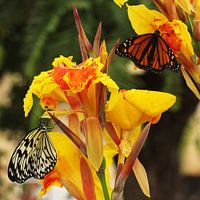 Foto van twee verschillende soorten vlinders op gele lelies. Deze foto is ideaal voor een tuinposter /tuinposters.