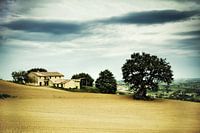 Oude vervallen boerderij in Mergo (Le Marche) Italië. Old Farmhouse in Le Marche, Italy. Prachtig uitzicht over een veld waar het nieuw graag net bovenkomt.