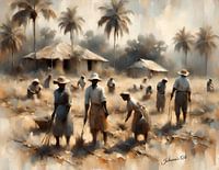 Verschillende personen zijn aan het werk in wat een zonovergoten landbouwveld lijkt te zijn. Sommigen dragen gereedschap en bukken alsof ze gewassen aan het planten of oogsten zijn. Op de achtergrond zijn rieten hutten en weelderige palmbomen te zien, wat bijdraagt aan de landelijke, tropische sfeer van de scène.