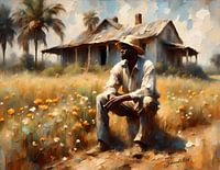 In een zonovergoten veld vol wilde bloemen zit een man vredig op een stuk hout, mogelijk zijn omgeving te overpeinzen. Achter hem staat een traditioneel, enigszins verweerd huis geflankeerd door palmbomen, alles badend in goudkleurig licht, wat een warme, serene sfeer suggereert.
