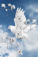 Witte duif op een achtergrond van een blauwe wolkenlucht. Met prachtige orchideeëntakken.