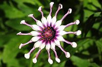 Foto van één wit/paarse bloem met een groene achtergrond. Deze foto is ideaal voor een tuinposter /tuinposters.
