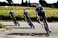 Drie renners van de wolfpack scheuren door de velden, met een kerk op de achtergrond rijden ze door het landschap en laten ze een schaduw achter op de grond. Mooie fresco voor fans van de ploeg, herken jij welke renners het zijn.
