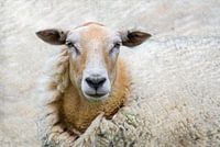 De kop van het schaap is mooi, grappig of verrassend vastgelegd tussen de wollen dekens van de kudde genoten.