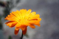 Foto van een gele margriet met waterdruppels tegen een grijze achtergrond. Deze foto is ideaal voor een tuinposter (tuinposters).