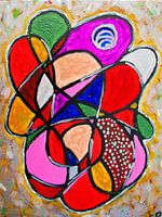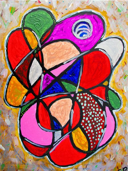 Het werk is opgebouwd uit organische, afgeronde vormen die in elkaar lijken te vloeien, waardoor een dynamische en speelse compositie ontstaat. De dikke zwarte contouren geven het geheel structuur en definitie.