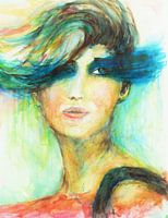 Portret/ Vrouw / Schilderkunst / Aquarel/ Kleur / Figuratieve kunst / Fashion model / Mode /Oogschaduw / Blauwe oogschaduw / Wind / Haar / Roze / Blauw / Groen / Turquoise / Kijken / Omkijken /