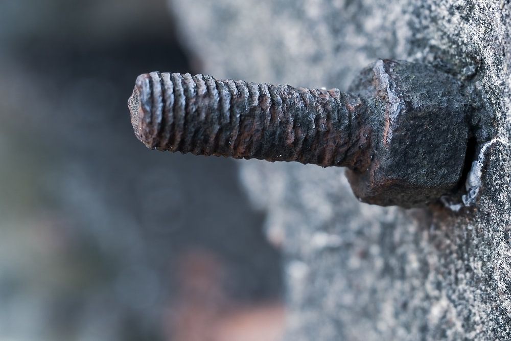 Een verroeste bout steekt uit het beton van een bunker uit de 2e wereldoorlog op de Grebbeberg in Rhenen in Nederland.