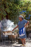 Een Kaapverdiaanse vrouw houdt de barbecue in de gaten, terwijl haar strenge blik de rest van de omgeving in de gaten houdt. Met haar blauwe jurk, blauwe schort en scherpe bik maakt ze net zo'n pittige indruk als de kipjes op de barbecue.