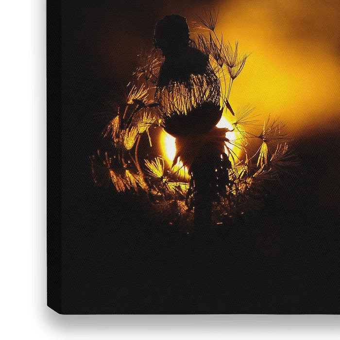 Een tegenlicht opname van de pluizen van een Paardenbloem bij zonsondergang
