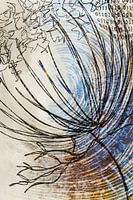 Digitale kunst ‘The center of nature’. Dit werk is ontstaan vanuit de behoefte meer kleur en spanning aan te brengen in mijn beelden als tegenhanger voor de strakke zwart-wit werken. Ik heb een uitsnede van een bestaand werk (wortelbloem) gebruikt als basis en daarbij een compositie van fotobeelden, penseelstreken en digitale vlakken gebruikt die in elkaar op- en overgaan.