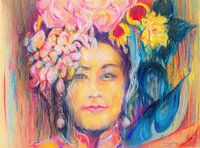 Zij kijkt ons olijk aan en heeft een glimlachje op haar gezicht. Op haar hoofd heeft zij een bloemenpracht in fel roze kleuren. De bladeren zijn fel en stralend blauw.