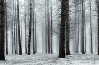 De sneeuw en mist in de winter zorgen voor een mooie serene sfeer in dit bos in Nederland.