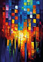 Een krachtig samenspel van warme kleuren en tinten, die samen een licht, kleurrijk en dynamisch patchwork creëren. Intrigerend kleurrijk abstract schilderij gemaakt met grove penseelstreken en paletmes techniek.