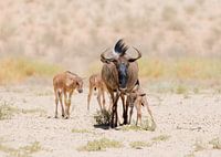 Wildebeest met jongen in de Kgalagadi Transfrontier park in Zuid Afrika! Hoge temperaturen en weinig te eten!