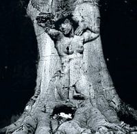Voor dit contrastrijke werk heb ik twee foto's gecombineerd en bewerkt tot deze mysterieuze afbeelding. Het lijkt zo net of de vrouw onderdeel uitmaakt van de boom.
