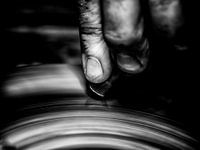 Een edelsteen wordt tegen een slijpschijf gehouden om een facet aan te brengen