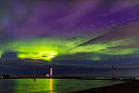Een vuurtoren in Reykjavik in Ijsland onder het noorderlicht ook wel de Aurora Borealis genoemd.