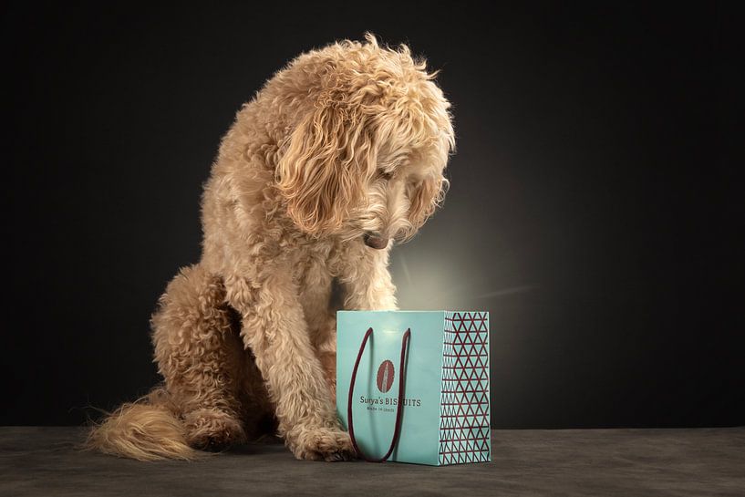 De hond op deze foto is een GoldenDoodle. Ze is zeer geduldig en gek op koekjes!! Deze Magic Biscuit Bag is haar droom die uitkomt ;-) Wat zal erin zitten?