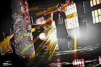 Een kleurrijk en tegelijkertijd zwart/wit werk in de Film Noir en Sin City stijl laat een scene zien van een verlaten pakhuis met daarin een stilstaande auto met brandende koplampen. Voor de auto staat een man met een hoed en een lange regenjas die een sigaret lijkt te roken.