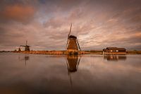 Deze foto is gemaakt vlak voor zonsondergang. De zon 'stond in mijn rug' waardoor een mooie, warme gloed over de molens van Kinderdijk (Zuid-Holland, Nederland) gleed. Gekozen voor een wijdse landschap waarbij alles naar het midden wijs.