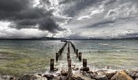 Bij Puerto Natales steken de oude pijlers van een steiger nog fier boven het water van de Golfo Almirante Montt baai uit. Op de achtergrond is Isla Diego Portales te zien. Puerto Natales ligt in de provincie Última Esperanza in Chili.