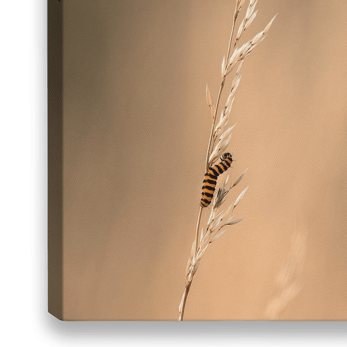 Een rups die langs tarwe omhoog kruipt.
