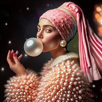 Dit digitale kunstwerk is een speelse en extravagante herinterpretatie van Meisje met de parel. De zachte roze tinten, de luxueuze stoffen en de parels die overal schitteren geven het een magische, bijna sprookjesachtige uitstraling. De bubbel van parelmoer voegt een dromerig en surrealistisch element toe, terwijl de sterren achtige fonkeling de elegantie versterkt. Een unieke combinatie van glamour en klassieke schoonheid.