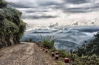 Op weg van Kunming in China naar Hanoi in Vietnam ging de doorgaande weg over van een asfalt weg in een keienweg met een prachtig uitzicht op de omringende in nevelen gehulde bergen.
