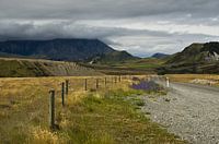 Deze foto heeft een sterke perspectief met een autoweg en houten paaltjes die in de verte verdwijnen. Op de achtergrond zie je de heuvellandschappen en een imposante berglandschap die tot de wolken komen.