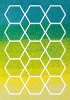 Strakke en minimalistische geometrische vormen (hexagon of hexagoon) gecombineerd met het contrastrijke en vloeiende kleurgradaties van met airbrush aangebrachte aquarel in geel blauw en groen.