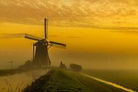 Zonsopkomst bij de Molenviergang te Aarlanderveen/Alphen aan de Rijn in Het Groene Hart. Een koude morgen met laaghangende mist. De lijnen van het water en van het pad trekken de toeschouwer regelrecht naar de gerestaureerde molen.