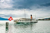 The steam ship La Suisse set sails from Montreux port (Switzerland), by the Leman lake.