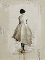 Dit kunstwerk ademt stilte, elegantie en een vleugje nostalgie. De vrouw, weergegeven van achteren in een zachte jurk, straalt eenvoud en mysterie uit. De neutrale tinten, gecombineerd met subtiele tekstfragmenten in de achtergrond, geven het werk een poëtische en tijdloze uitstraling. Perfect voor interieurs met een serene, minimalistische of vintage sfeer.