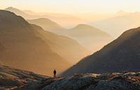 Een man kijkt naar de vele lagen bergen tijdens een mistige en kleurrijke zonsondergang in de herfst. Nabij Chamonix in Frankrijk.